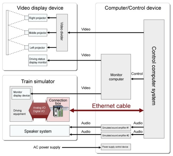 The driving simulator comprises the driving equipment installed in the operation console of the train simulator, the control computer system, which re-creates the operation environment as close as possible to the actual train based on minute physical calculations, and the image display and audio equipment, which creates an immersive experience.