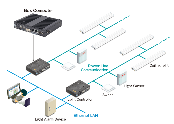 The Contec BOX COMPUTER is embedded as an illumination controller, and it provides the appropriate brightness by sending commands to the controlled illumination device according to the ambient brightness and changes in brightness.