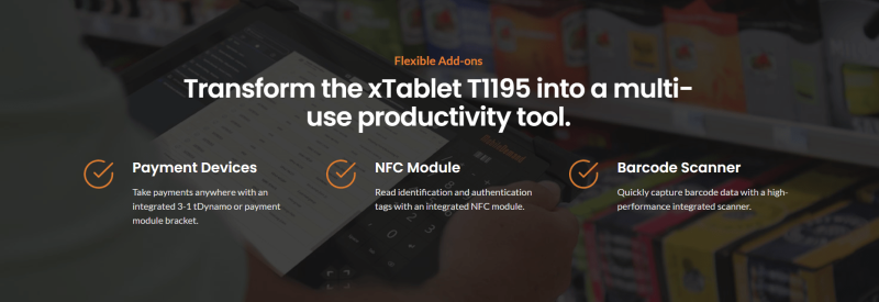 Transform the xTablet T1195 into a mobile credential-based authenticator with the optional, integrated NFC module from rf IDEAS. Designed to track employee attendance, enable device sign-in, scan loyalty cards, track tagged assets and grant access to events and other venues via phones, cards or wristbands.